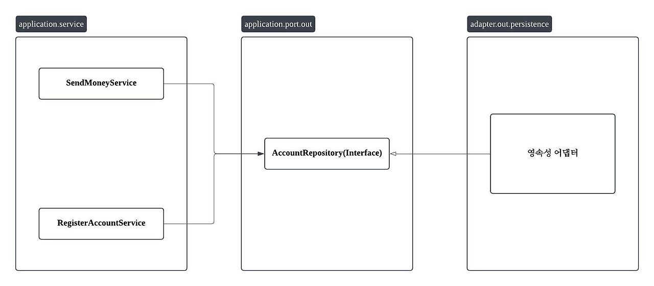애플리케이션 서비스에서는 영속성 기능을 사용하기 위해 포트 인터페이스를 호출한다. 이 포트는 실제로 영속성 작업을 수행하고 데이터베이스와 통신할 책임을 가진 영속성 어댑터 클래스에 의해 구현된다.