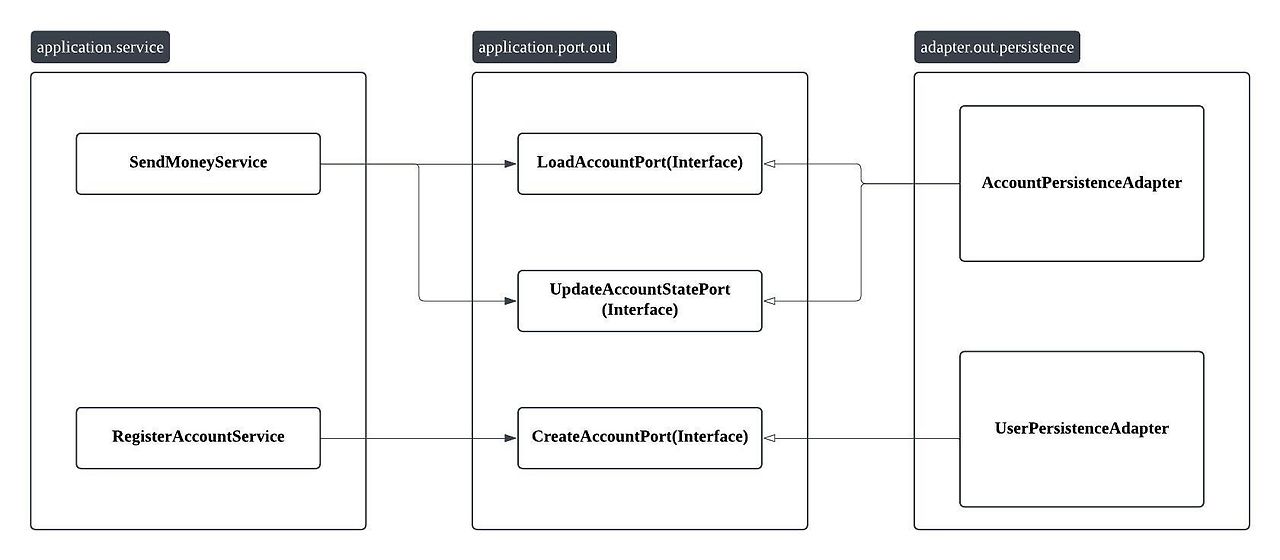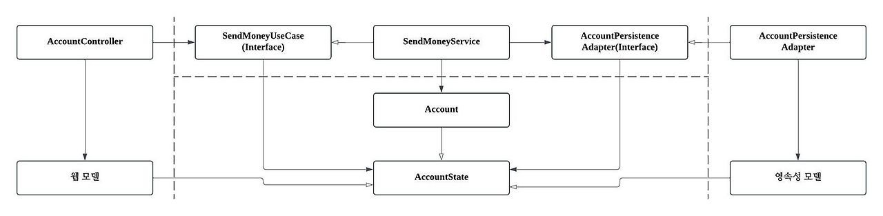 SendMoneyService는 인커밍 포트 인터페이스인 SendMoneyUseCase를 구현하고, 아웃고잉 포트 인터페이스이자 영속성 어댑터에 의해 구현된 LoadAccountPort와 UpdateAccountStatePort를 사용한다.