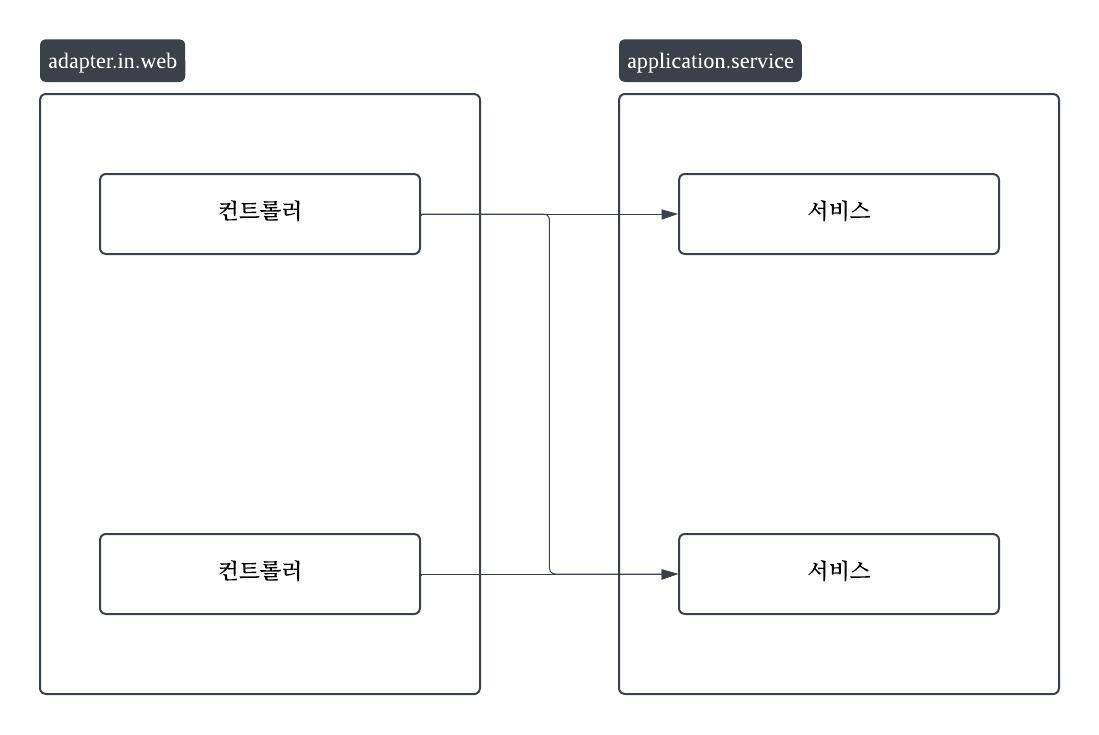 또한, Service의 클래스명을 수정하였다. 그러나 기능에 의한 패키징 방식은 사실 계층에 의한 패키징 방식보다 아키텍처의 가시성을 훨씬 더 떨어뜨린다. 어댑터를 나타내는 패키지명이 없고, 인커밍 포트, 아웃고잉 포트를 확인할 수 없다.