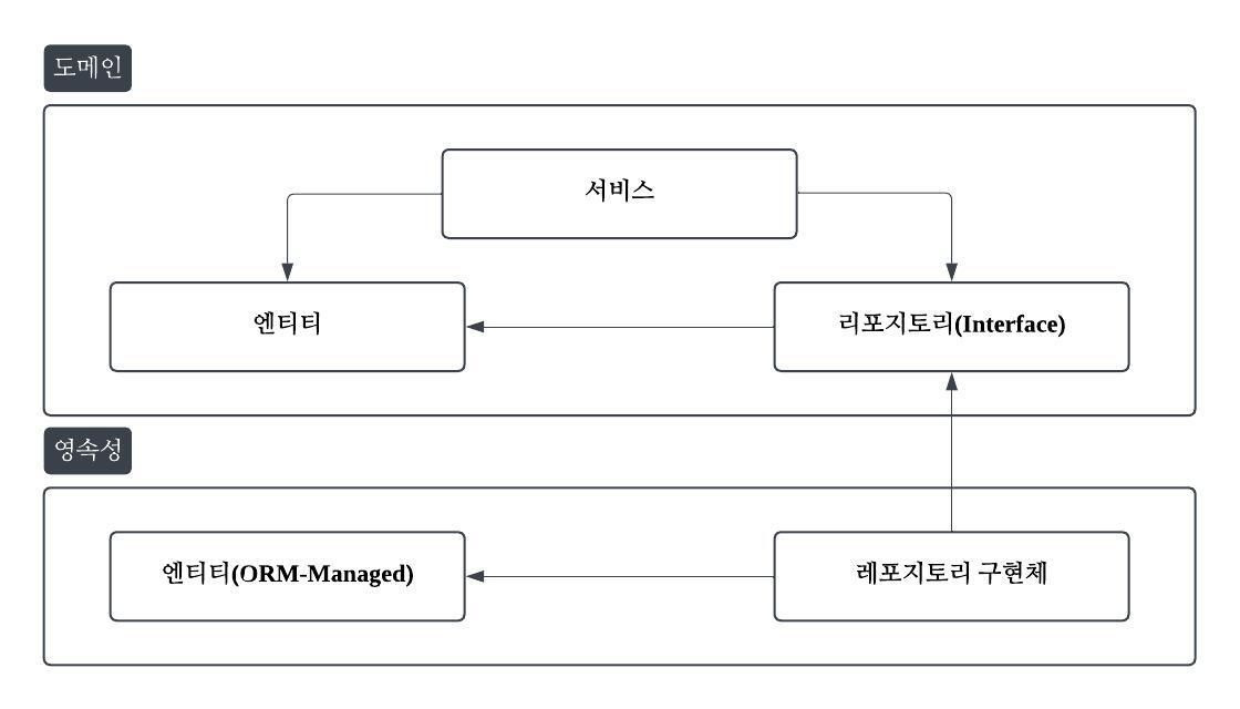 의존성 역전은 어떻게 동작할까? 그림 2에서는 도메인 계층의 서비스가 영속성 계층의 엔티티와 레포지토리를 의존하고 있다.