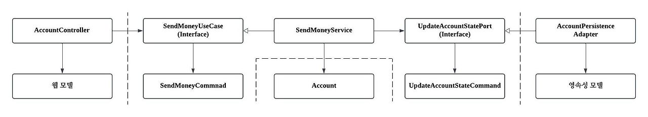 SendMoneyService는 인커밍 포트 인터페이스인 SendMoneyUseCase를 구현하고, 아웃고잉 포트 인터페이스이자 영속성 어댑터에 의해 구현된 LoadAccountPort와 UpdateAccountStatePort를 사용한다.
