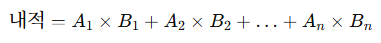 내적 계산 : 두 벡터의 각 원소를 곱한 후 모두 더합니다.
